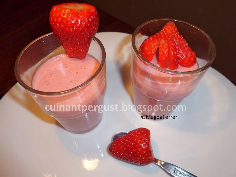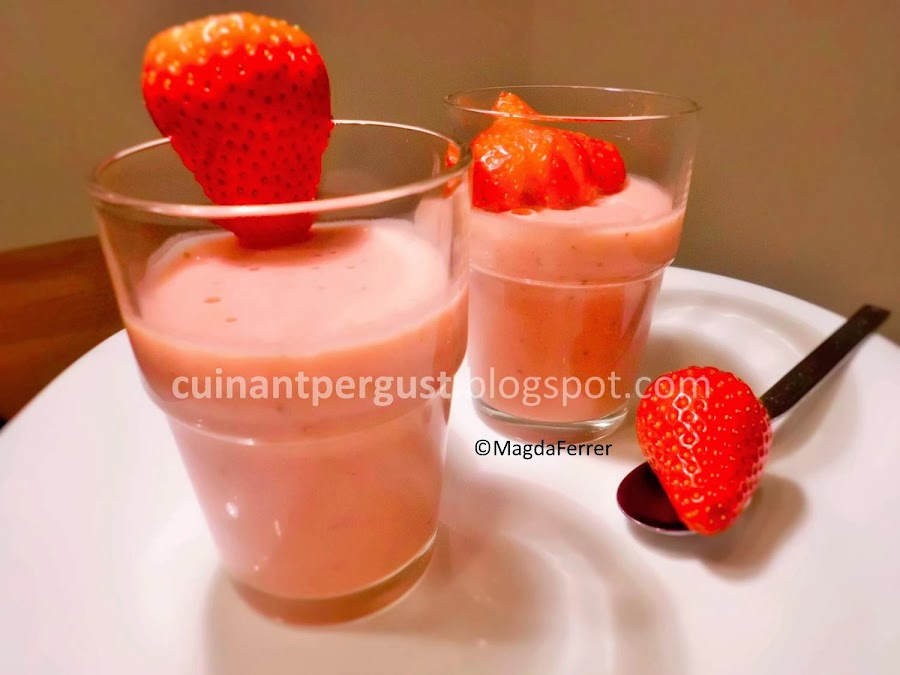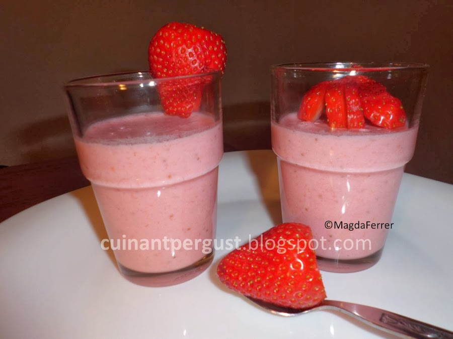 Poner las hojas de gelatina en remojo con agua fría. Lavar los fresones, desechar las hojas y la parte blanca y trocearlos. Reservar unos pocos para adornar. En un cazo junto con dos cucharadas de azúcar poner a calentar los fresones cortados. Mientras se calientan triturarlos con la batidora eléctrica hasta convertirlos en un puré fino. Añadir la nata (crema de leche), el queso y un par de cucharadas de azúcar. Remover y añadir más azúcar si es necesario. Escurrir la gelatina e incorporarla a la mezcla anterior. Remover para que se integre y apagar el fuego. Repartir la mezcla en vasitos o tarrinas individuales y dejar enfriar en el frigorífico hasta que cuaje. Adornar con un fresón. Servir.