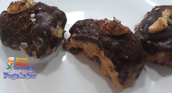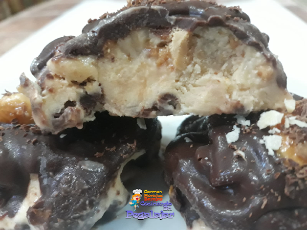La haremos en formatos individuales, estos pastelitos son un Semifrío de Frutos secos con Cobertura de Chocolate. En el relleno interior se prepara una mezcla con Turrón de Jijona y nata (crema de leche). También lleva Frutos Secos variados.