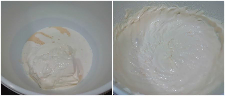 Ponemos la nata (crema de leche) (que debe estar bien fría) en un bol junto a la leche condensada. Batimos hasta montar y agregamos poco a poco el zumo de limón. Mezclamos bien y reservamos.