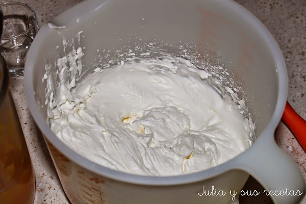 Montamos la nata (crema de leche) hasta que está consistente y la reservamos.