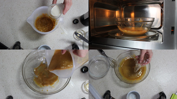 Lo ponemos en un cazo y lo cocemos hasta que coja consistencia de crema. Yo lo he metido un minuto al microondas a 800w. Añadimos la gelatina escurrida y lo mezclámos enérgicamente con las varillas manuales, la dejamos templar.