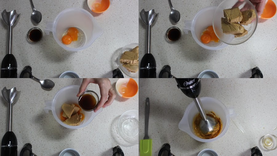 En un bol desmenuzamos el turrón y añadimos las yemas de huevo, añadimos el vino dulce y lo trituramos con la batidora.
