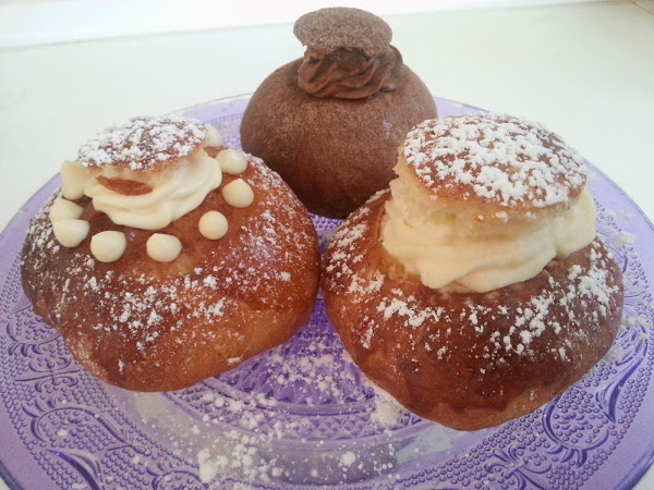 Cuando estén fríos los panes, retiramos con un corta pastas redondo o con un cuchillo un circulo de la parte superior, quitamos un poco de relleno y rellenamos los panecillos con el mazapan o con mermelada de arándanos, encima regamos nata (crema de leche) o trufa según el caso y ponemos la tapita del pan encima, regamos con azúcar glass y ponemos los panecillos en un recipiente con un poco de leche para que moje el bollo del Semla.