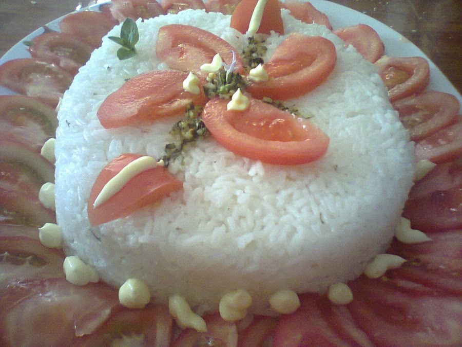Un arroz blanco, cocinarlo siguiendo la indicación del paquete, condimentar, poner aceite a gusto...yo siempre le pongo unas gotitas de vinagre de manzana....y cortar los tomates y dejar volar la imaginación!!!!....mayonesa y tienen su obra de arte en la mesa!!!