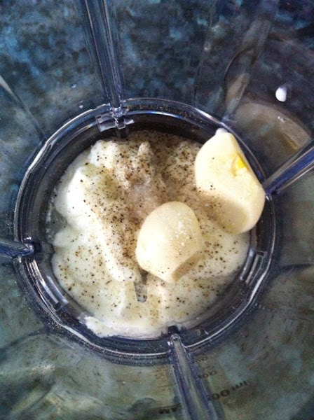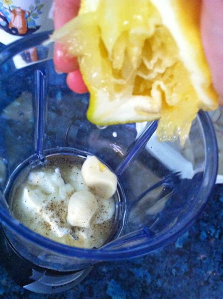 Es tan sencillo como poner en la batidora el yogurt natural con los 2 dientes de ajo, una pizca de sal, un poco de pimienta negra molida y el zumo de medio limón.