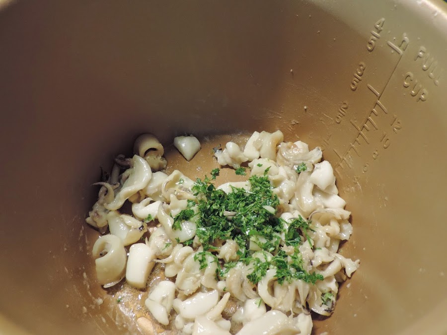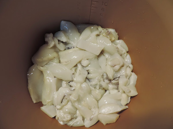 Limpiamos y cortamos los champiñones con ayuda del laminador, ponemos unas gotas de aceite de oliva y los echamos en la cubeta de la olla.