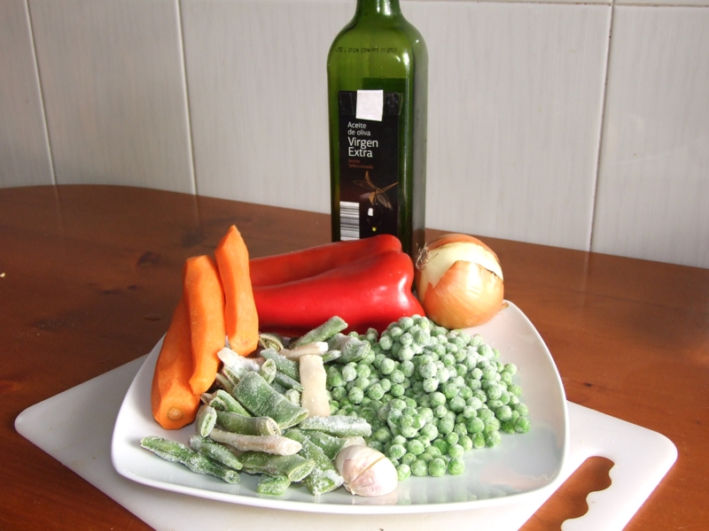 pasados 20 minutos la verdura debe estar cocida, como la hice al vapor no tengo que escurrirla. Caliento aceite en una sartén grande, agrego la picada de ajo, cebolla y pimiento, un chorrito de vinagre, y rehogo unos cinco minutos.
