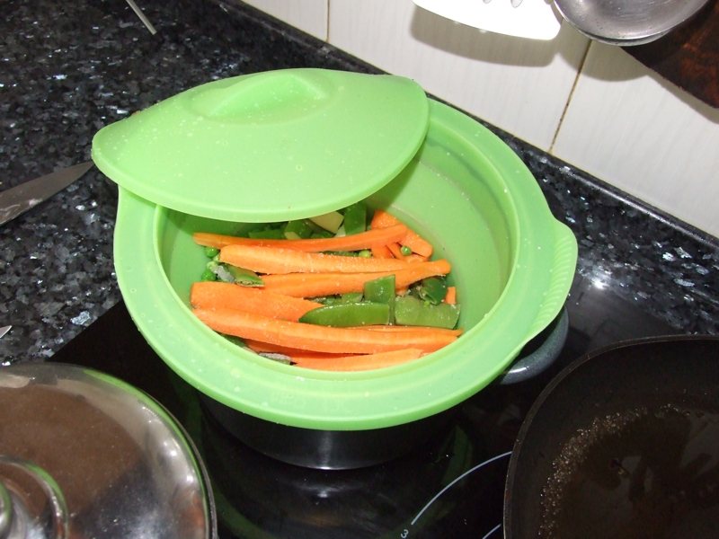 Para hacer la verdura me compré un utensilio de cocinar al vapor de silicona que voy a estrenar a ver que tal va. Pongo un poco de agua en una olla alta y que me quepa el aparato sin que se hunda, pongo dentro la verdura, las zanahorias simpre las corto a lo largo en tiras, dicen los entendidos que ablanda antes y sabe mejor, añado la sal.