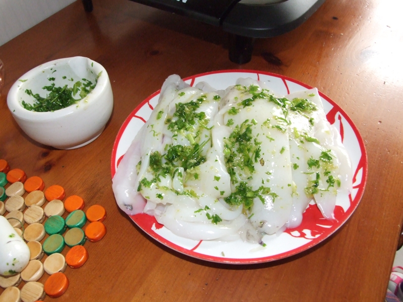 Untamos los trozos de sepia con la mezcla por ambos lados y reservamos, observen que no pongo sal,