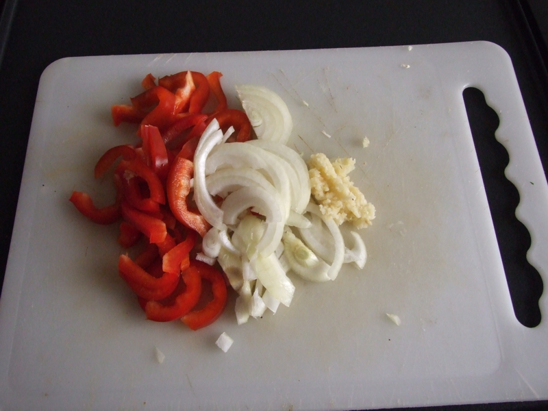 Tapamos y a esperar que hierva, me gusta hacerlo al vapor porque así conservan mas el sabor y no pierden propiedades alimentarias. Mientras corto la cebolla los otros dos dientes de ajo y el medio pimiento.