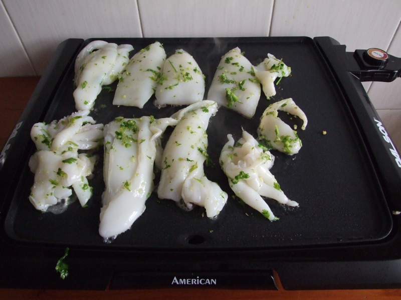 Ponemos a calentar la plancha, y la untamos en toda la superficie con aceite de oliva, yo uso un spray, pero lo podéis hacer con un chorrito y untar con papel de cocina. Si no tenéis plancha una sartén antiadherente os vale. cuando está caliente ponemos la sepia bien colocadita sin que queden una pieza sobre otra.