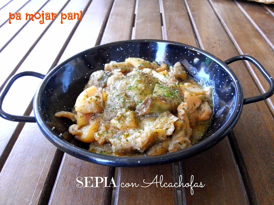 Mientras limpiamos y cortamos las alcachofas a cuartos. Las añadimos y cocinamos durante unos 10 minutos a fuego suave.. A continuación añadimos la sepia que habíamos reservado y salteamos durante 10 ó 12 minutos más. Agregamos el vino blanco y dejamos que se evapore. Seguidamente echamos el fumet que previamente habremos calentado.