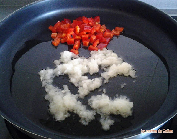 En una paellera con aceite, sofreír la cebolla y los pimientos.