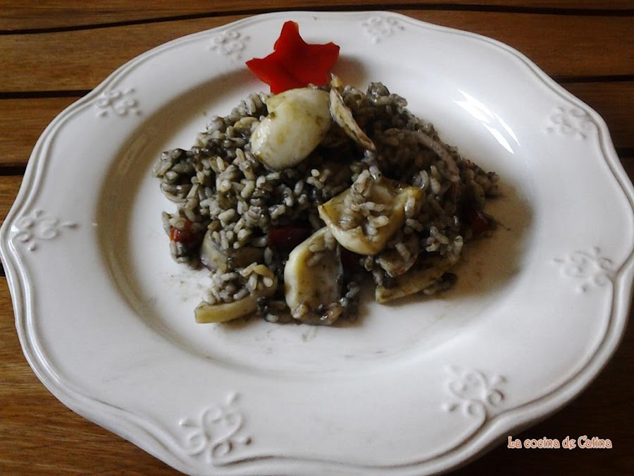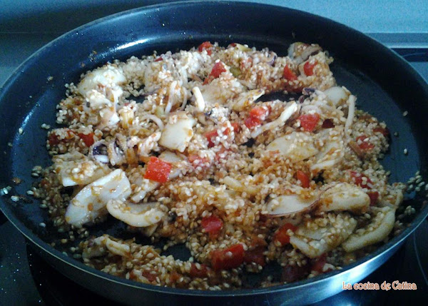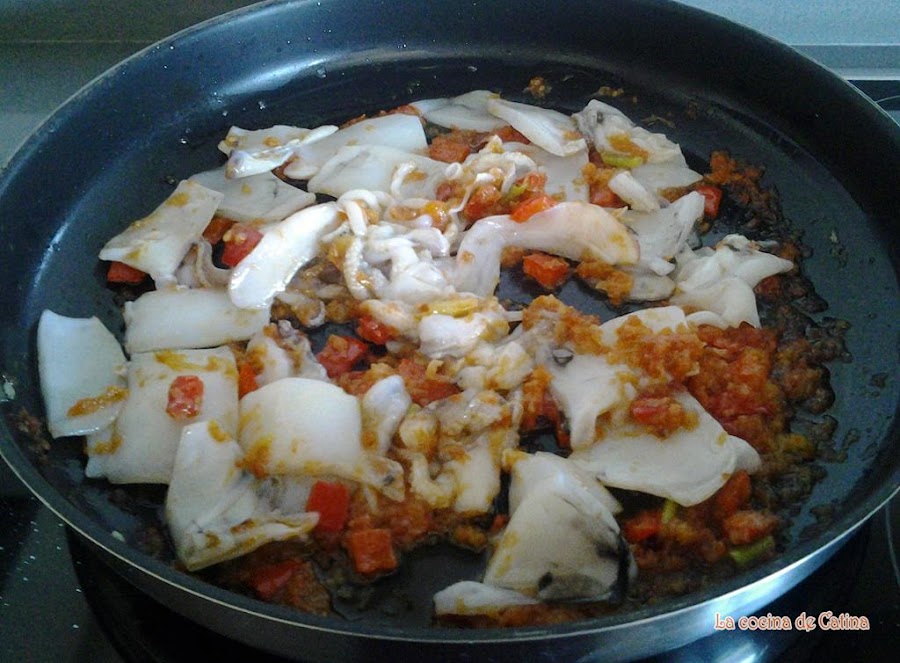 Cuando está sofrito se añade el tomate y seguimos friendo, añadir la sepia, el arroz y sofreír todo bien.