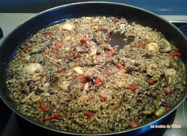 Echamos el vino, el caldo y la tinta disuelta en un poco de agua, sazonar y dejar cocer.