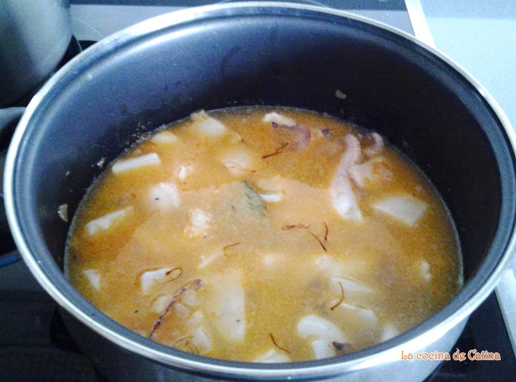 Ponemos una sartén con un chorro de aceite en el fuego y cuando está caliente echamos la cebolla cortada en juliana y los ajos pelados y picados, sofreímos durante cinco minutos hasta que la cebolla tome color. Echamos el tomate raspado, seguimos sofriendo otros cinco minutos, salpimentamos, incorporamos la sepia, mezclamos todo bien, añadimos el vino, el agua, el azafrán y el laurel. Cocemos 15 minutos a fuego lento, añadimos las patatas cortadas en trozos pequeños y los guisantes (yo he utilizado congelados).
