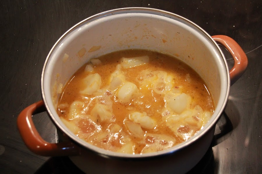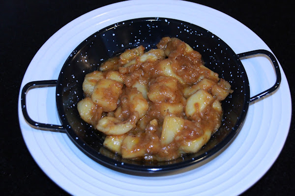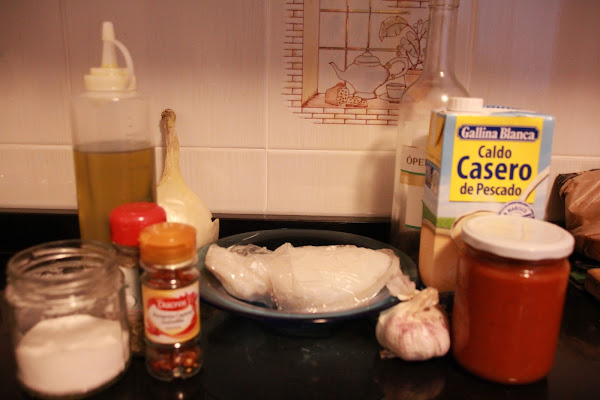 Picamos los ajos y la cebolla y los ponemos en una sartén con aceite. Cuando la cebolla comience a estar trasparente añadimos la sepia que habremos limpiado y cortado en trozos. La cocinamos hasta que comience a dorarse y le añadimos el coñac. Dejamos que se evapore el alcohol.