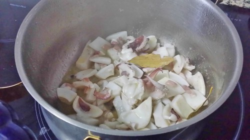 Poner la olla al fuego con el aceite. Cuando este caliente añadir la sepia junto con la pimienta y el laurel.