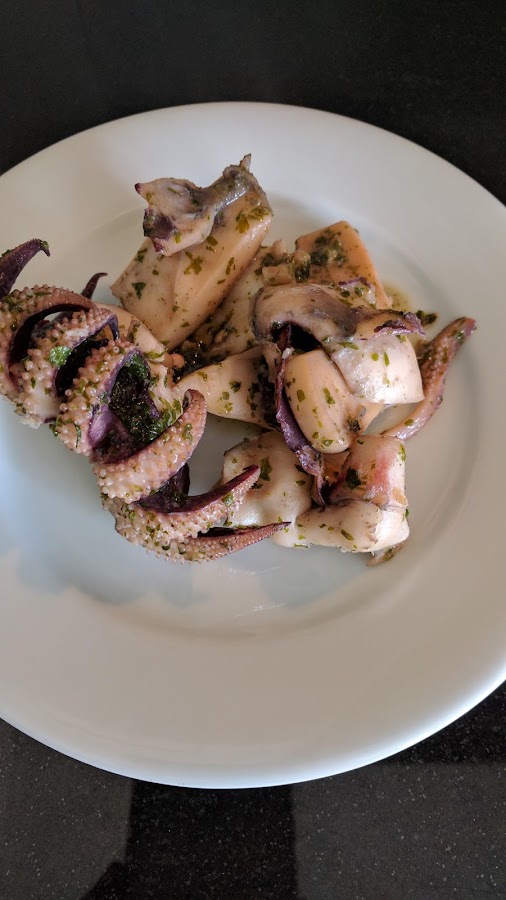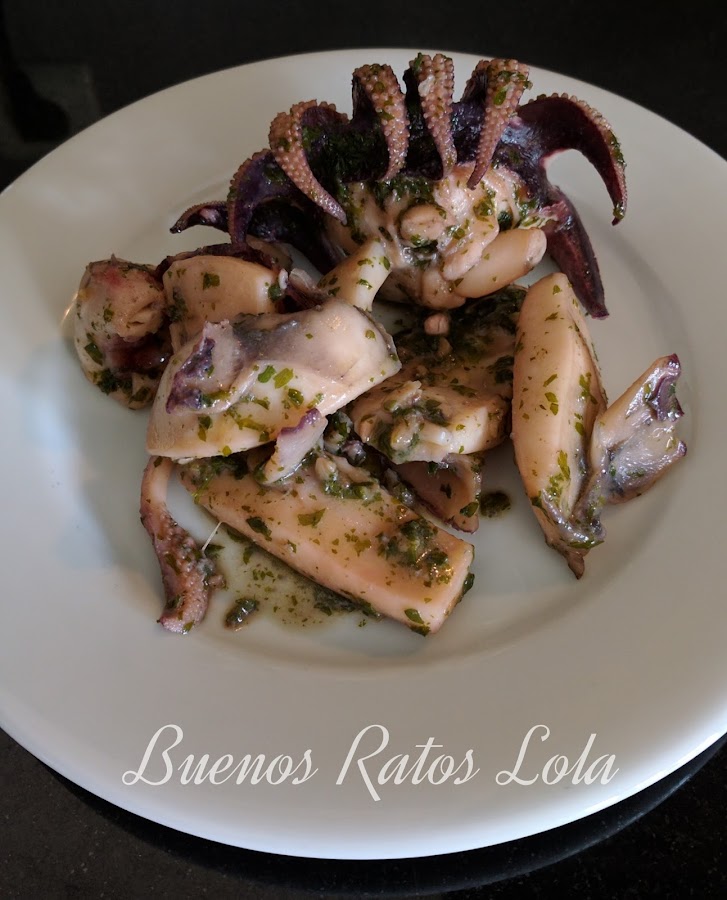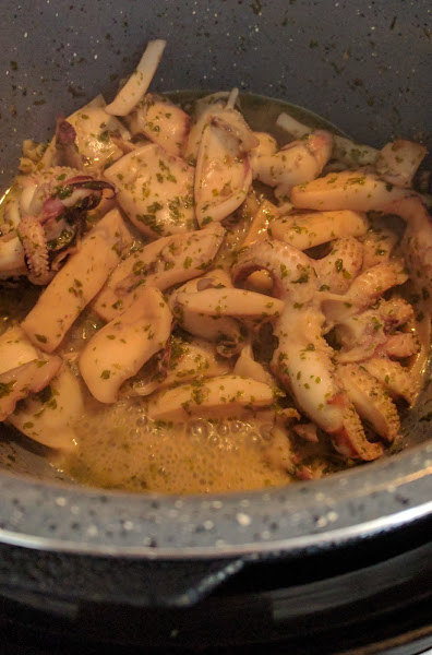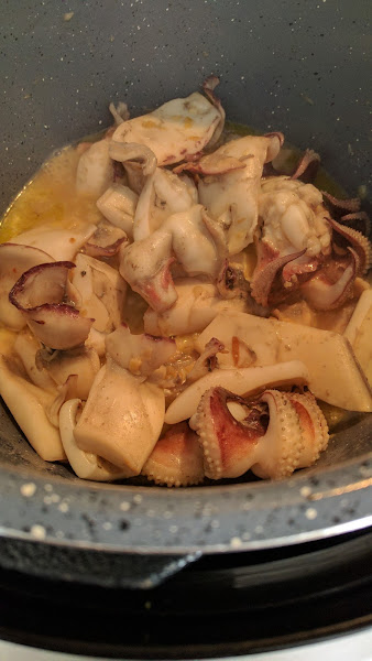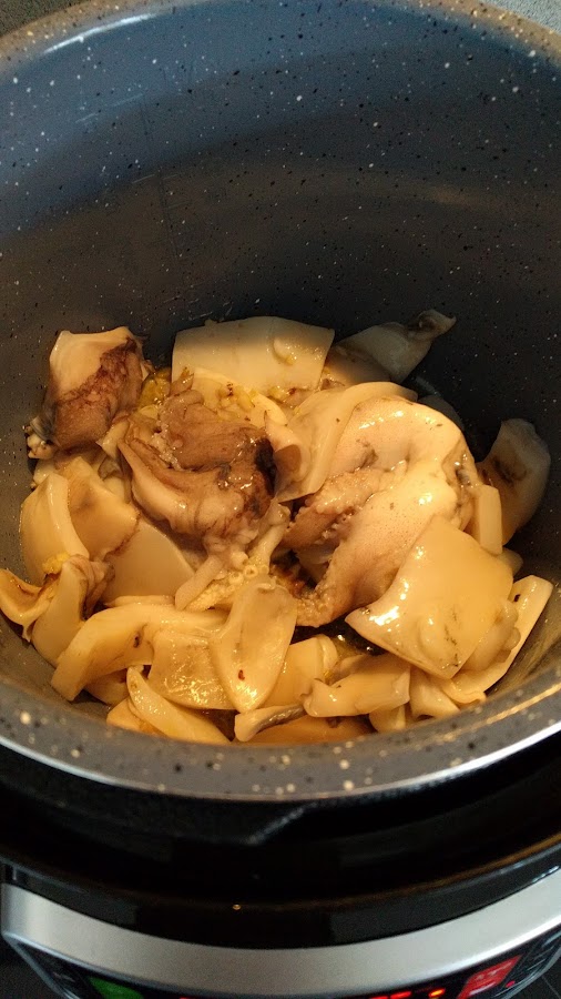 Ponemos el ajo y el aceite en la cubeta, menú plancha, 140 grados. Al empezar a dorarse echamos la sepia subimos a 180 grados y rehogamos. Dejamos que se haga, unos tres minutos.