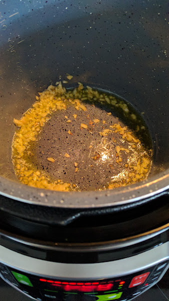 Añadimos el vino y dejamos que se evapore el alcohol. Salamos muy ligeramente. Cerramos la olla y programamos menú guiso, 5 minutos y 160 grados.