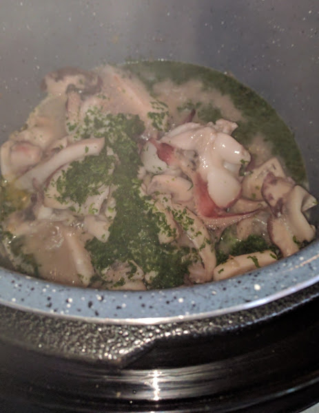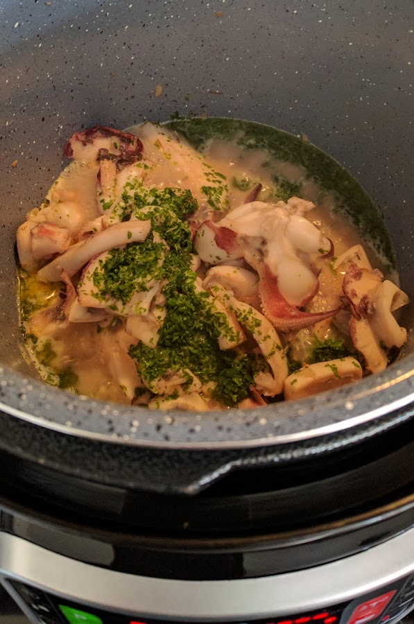 Despresurizamos manualmente. Añadimos el perejil, suficiente para coja tono verde, y programamos de nuevo menú plancha para que se evapore el caldo. Prueba y rectifica de sal, si fuese necesario. El tiempo que la mantengas a la plancha dependerá de si te gusta más blanda o mas "durita"