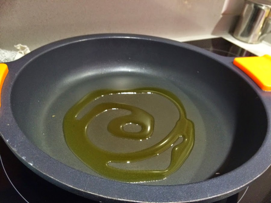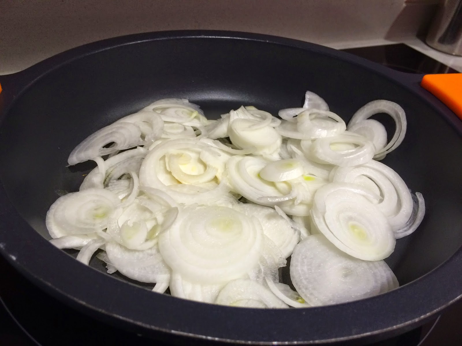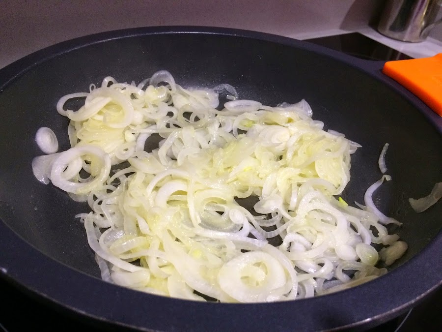 2. Calentamos la cazuela con un chorro de AOVE y a temperatura media vamos pochando las cebollas, ponemos al punto de sal.