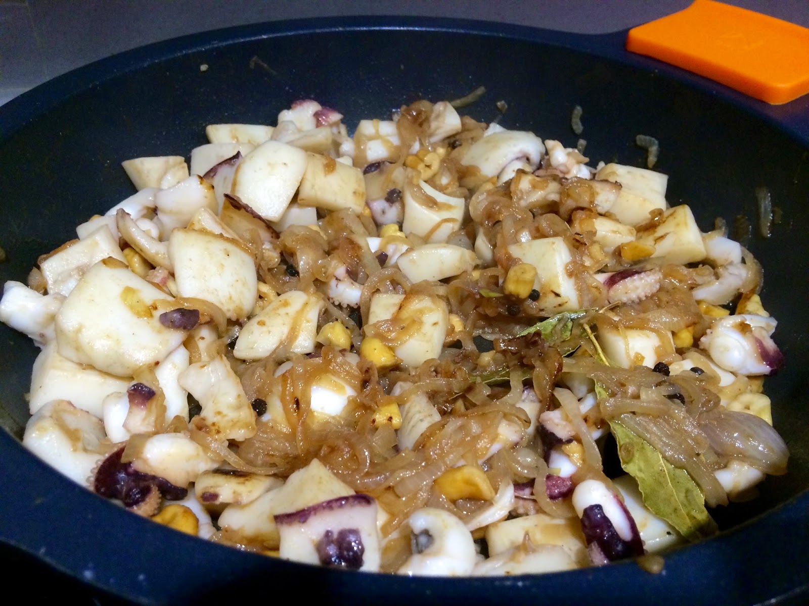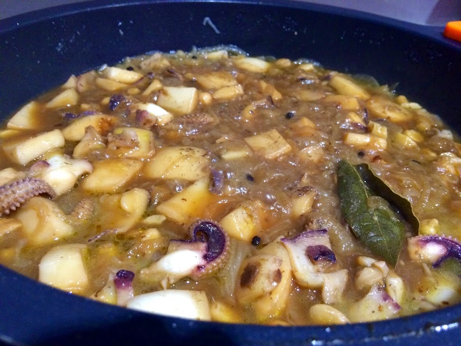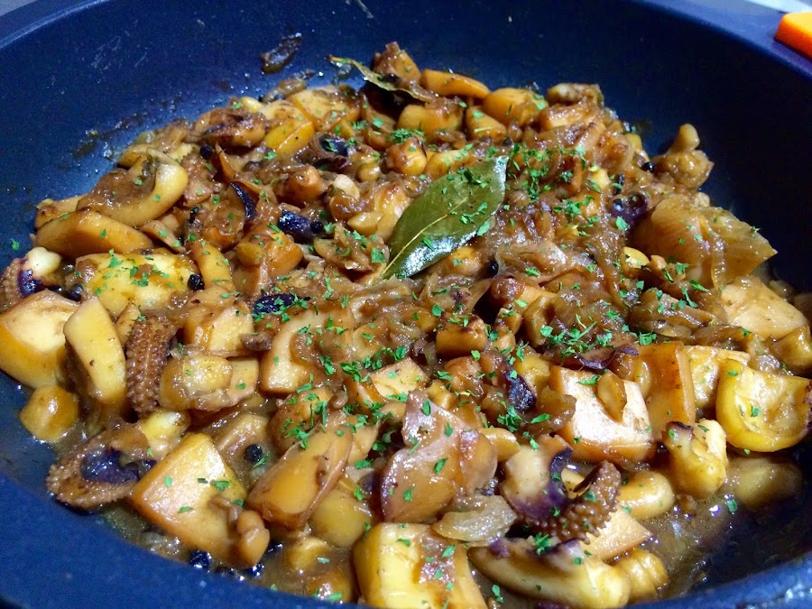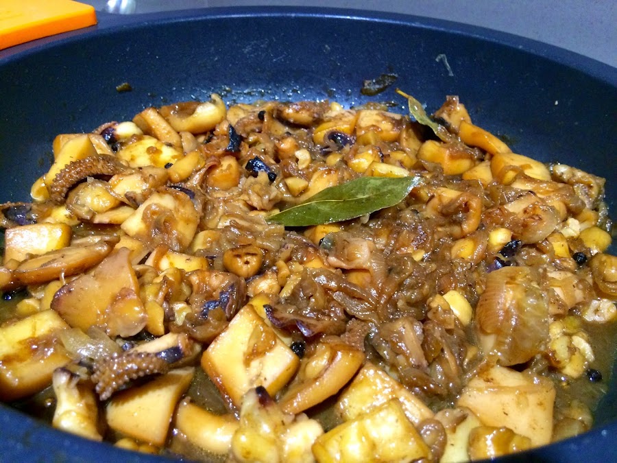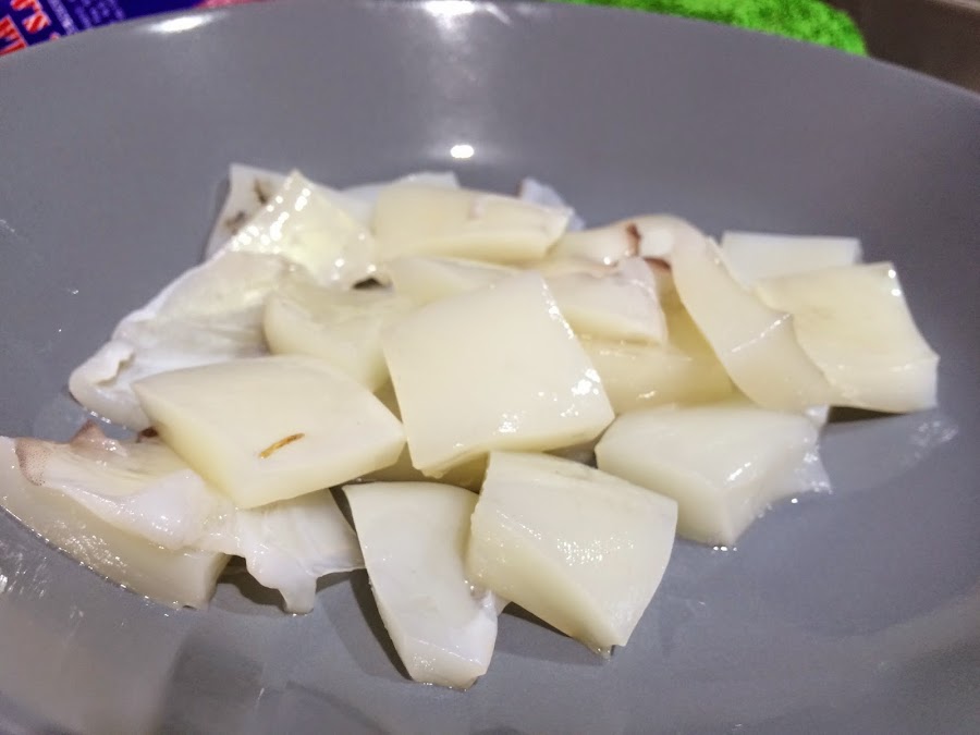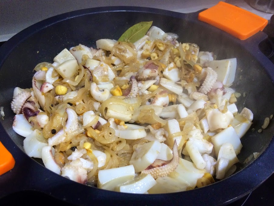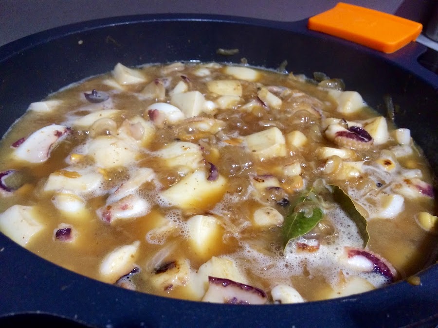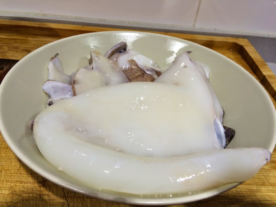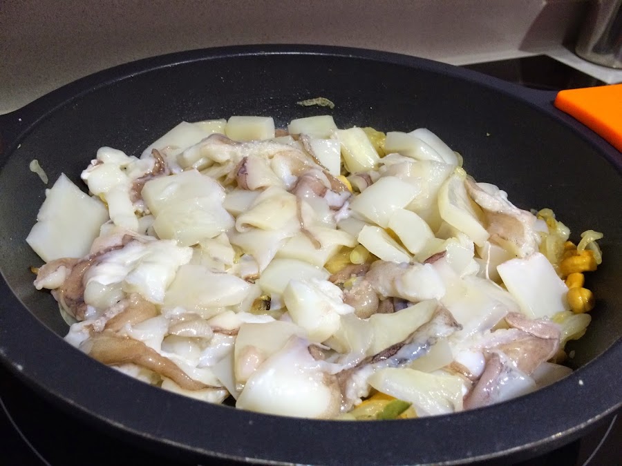 4. Mientras la cebolla se hace, lavamos bien las dos sepias. En la pescadería ya me las han dejado casi lista. Las troceamos en trozos medianos y reservamos.