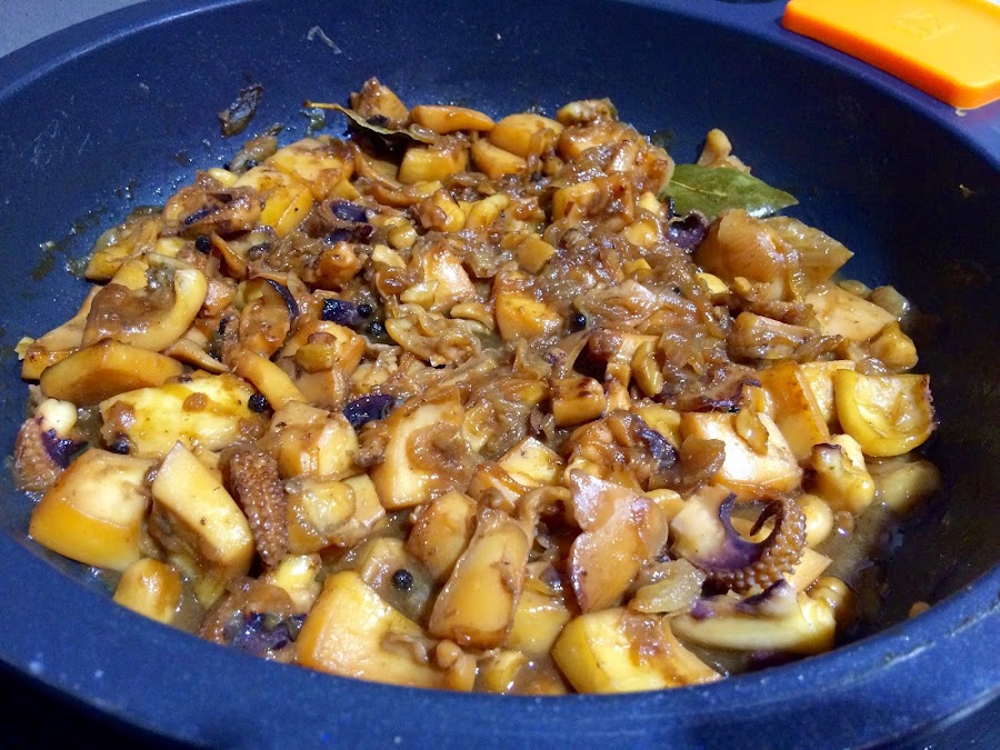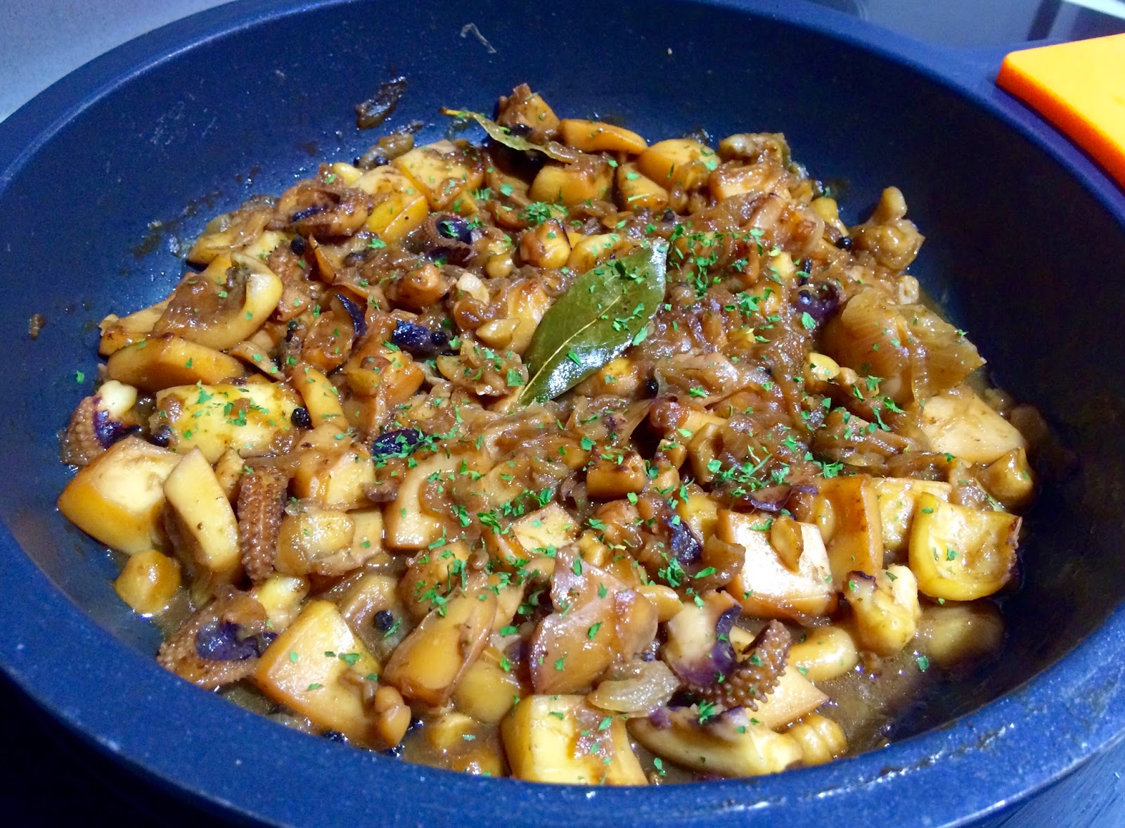 8. Pasados los 30 minutos, abriremos la tapa. Comprobaremos el punto de sal y dejaremos 30 minutos mas a fuego muy bajo, está vez sin tapar. Ir vigilando, no vaya a ser que se os quede sin salsa.