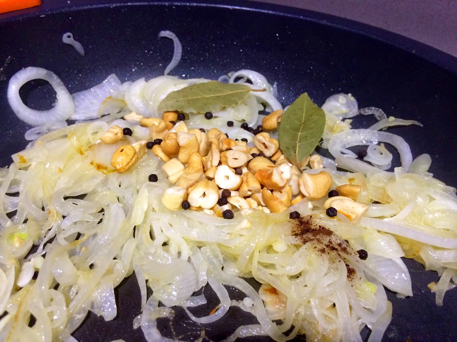 5. Cuando hayan pasado 12-15 minutos y empiece a tomar el color doradito añadimos los anacardos, los granos de pimienta, la pizca de clavo molido y las hojas de laurel. Seguimos otros 10 minutos hasta que la cebolla tome el color ideal.