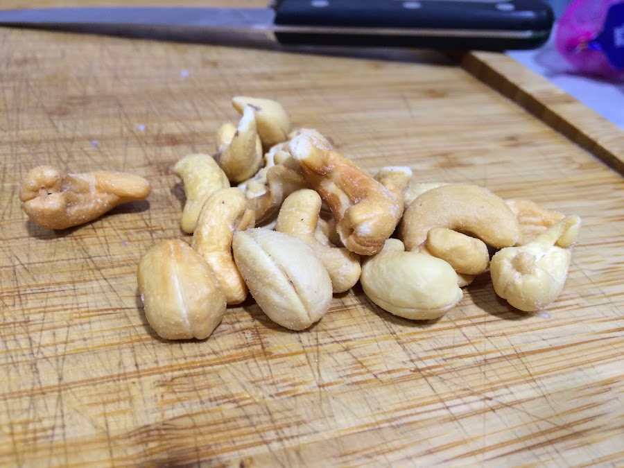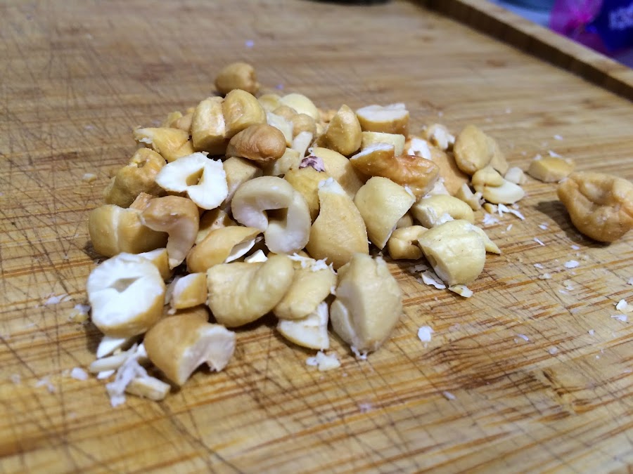 3. Mientras se dora la cebolla troceamos los anacardos. la receta original lleva piñones, pero como no tenía, improvisé. La próxima vez le pondré piñones para ver la diferencia.