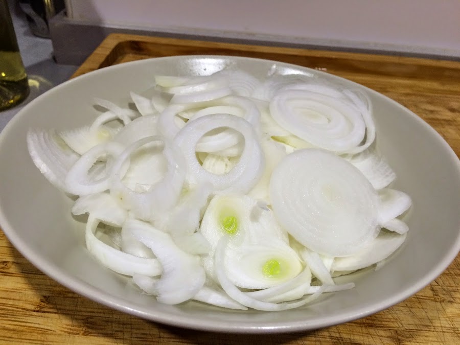 Paso a paso:1. Lo primero que hacemos será pelar y lavar las tres cebollas. Seguidamente con una mandolina o a mano las cortaremos a rodajas, ni muy finas ni muy gruesas.
