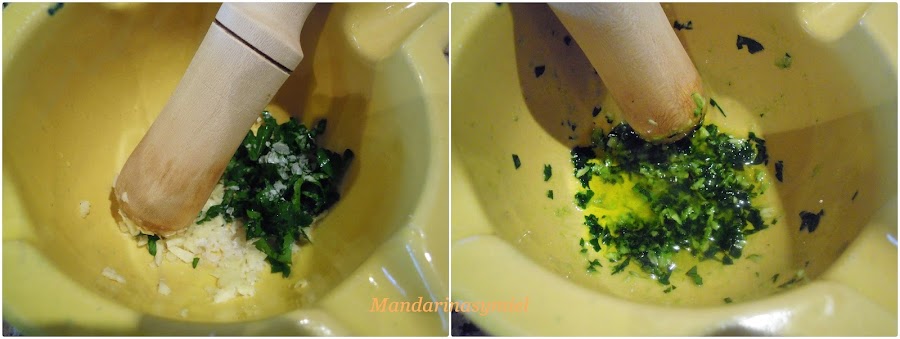 Pica dos dientes de ajo en un mortero, añade el perejil troceado y un puñadito de sal, pica todo bien con la maza del mortero.