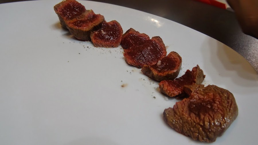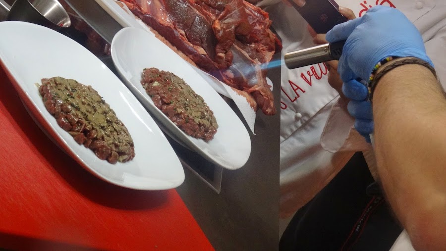 César clavó una lanza en contra de las cocciones largas (hay que tenerlas en cuenta pero siempre para determinas partes y determinados animales que requieren más tiempo de cocción debido a la dureza de la carne) y maceradas en vino durante días (el vino mata y camufla el sabor del producto que estamos tratando). Nos demostró que con cocciones cortas a la plancha o incluso en crudo se pueden conseguir resultados más que satisfactorios quedando una carne suave y nada fuerte como cabría esperar.