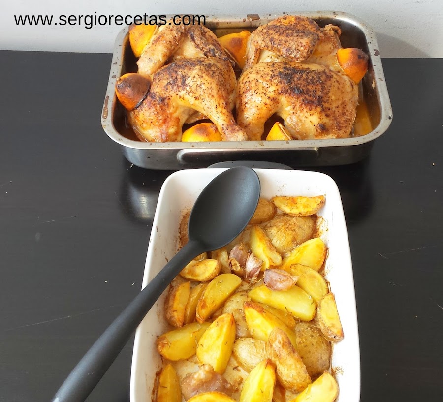 Pasado ese tiempo comprobaremos que las patatas están crujientes por fuera y tiernas en el interior y veremos si el pollo ya está hecho y perfectamente cocinado con una piel sin grasa, crujiente y un interior jugoso y sin estar crudo.
