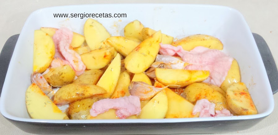Mientras está nuestro pollo en el horno prepararemos la guarnición de patatas asadas especiadas. Lavaremos bien las patatas a conciencia para eliminar todo resto de barro que pudieran tener, las secamos y las cortamos en cuartos y las vamos poniendo sobre una bandeja para horno. Las sazonamos con la sal y el pimentón dulce, ponemos los dientes de ajo y el romero, mezclamos bien y añadimos la grasa que reservamos de limpiar el pollo ( en vez de usar aceite usaremos esta grasa para potenciar el sabor). Cuando el Pollo lleve unos 20 minutos horneandose introduciremos las patatas y las cocinaremos durante unos 40 minutos aproximadamente, que será el tiempo que le quede al pollo por hacerse y así podremos servir ambas cosas a la vez.