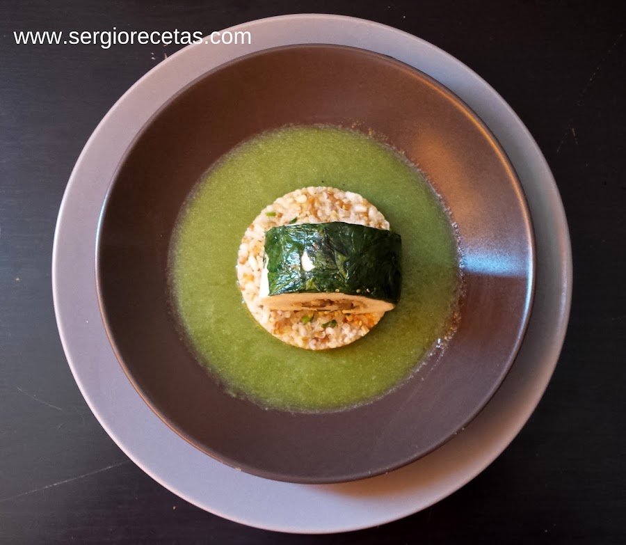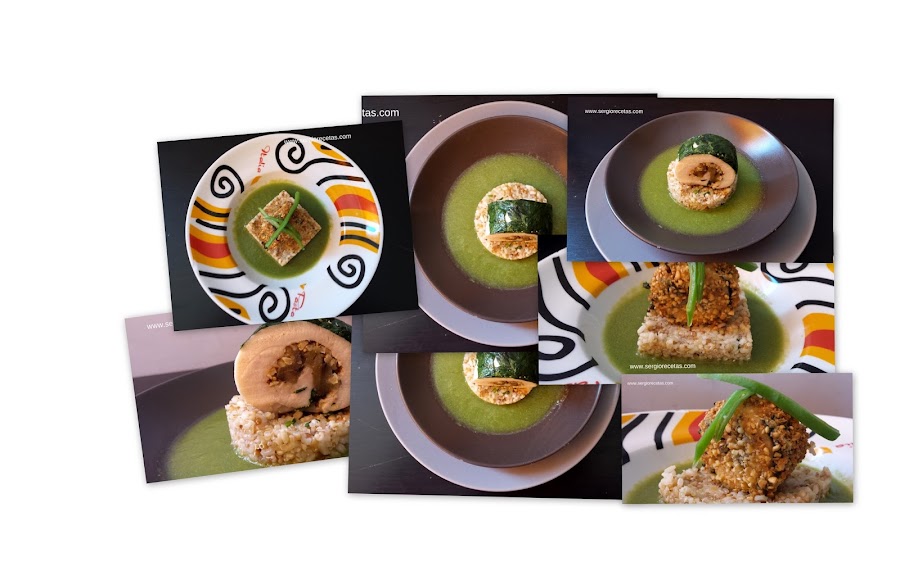 Abrimos bien la pechuga de pollo en un filete lo más fino posible que podamos ( podeis pedirselo a vuestro carnicero de confianza que os los prepare). salpimentaremos por ambas caras, untaremos con la mostaza antigüa y espolvoreamos unos granillos de almendra cruda. Colocamos la berenjena en el medio de la pechuga y las espinacas sobre un film transparente, Colocamos la pechuga enrollada sobre las espinacas y con ayuda del papel film vamos apretando hasta obtener un rollito bien prieto de pollo con toda la espinaca cubriendo la superficie y la berenjena en su interior.