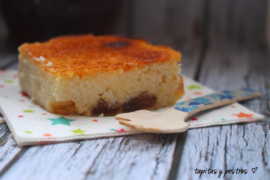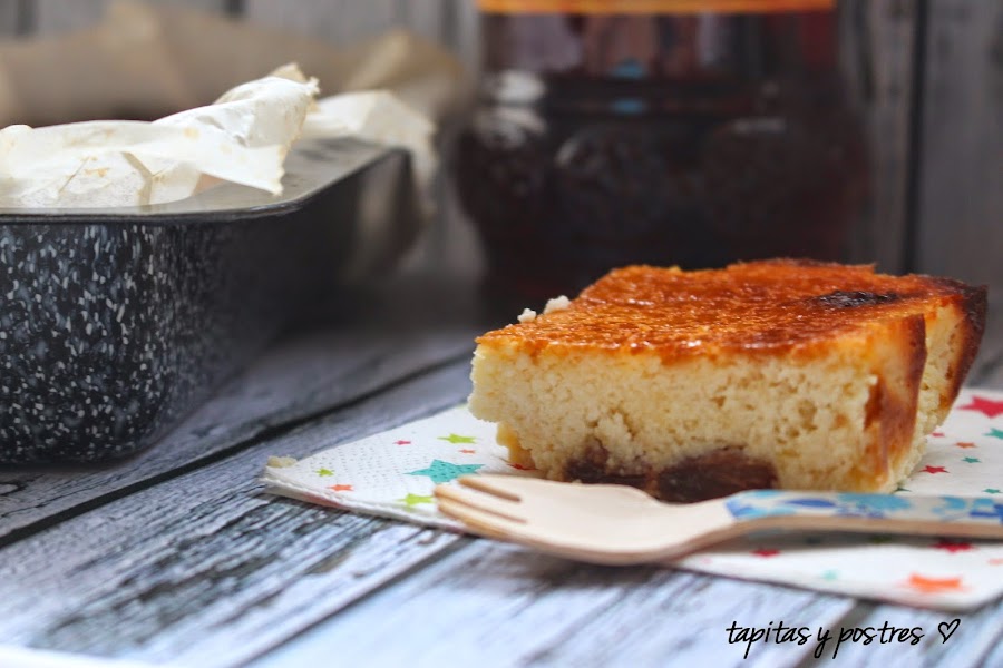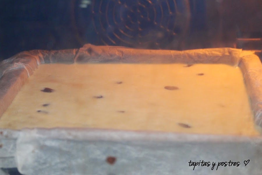 Sobre un molde cuadrado, colocamos una hoja de papel vegetal mojado y escurrido para que se adapte bien al molde. Vertemos la mezcla en el molde y ponemos por encima algunas pasas.