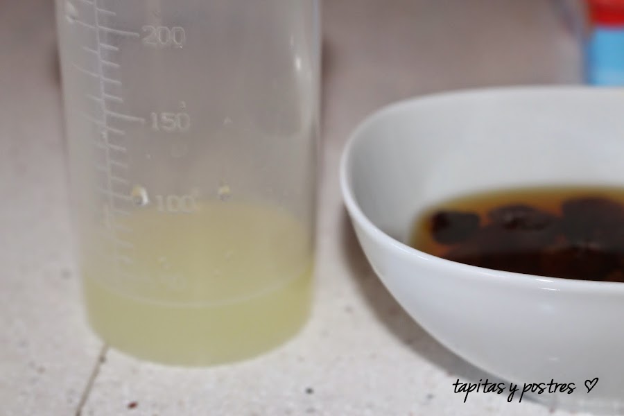 Quitamos la piel a un limón (sin nada de blanco) y exprimimos el zumo.