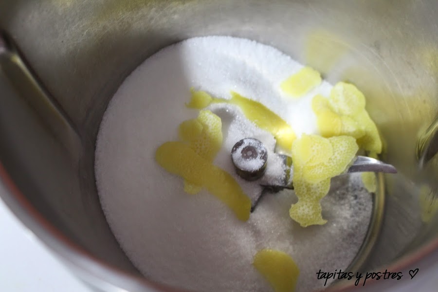 Ponemos el azúcar en el vaso y la piel del limón. Pulverizamos 15 segundos a velocidad 8-10.