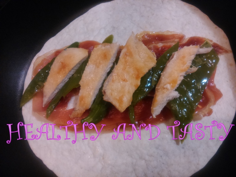 Montamos el serranito: Ponemos en una tortita de trigo la loncha de jamón y encima las tiras de pollo y pimiento.