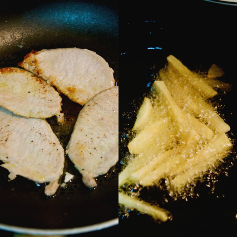 Heat some oil in a frying pan and cook pork loin slices until done. Do not overdo or they will be hard.