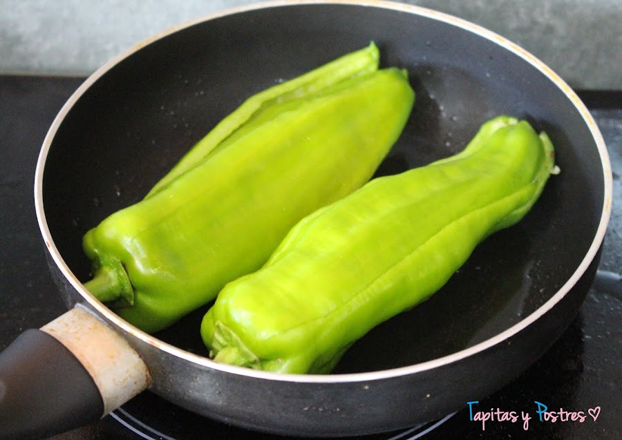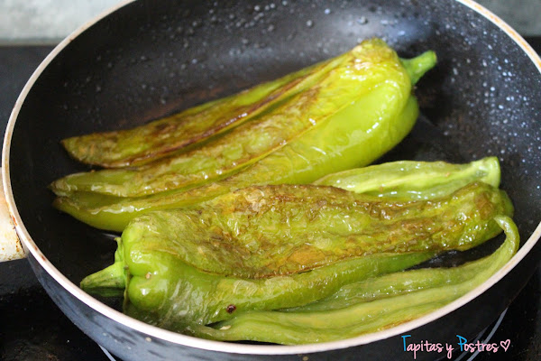 Lavamos bien los pimientos y los freímos en una sartén con un poquito de aceite.