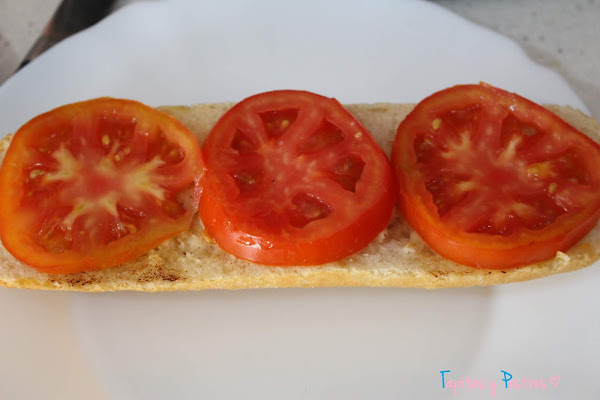 Ponemos unas rodajas de tomate en el pan, encima el lomo, los pimientos y por último el jamón. Cerramos y a disfrutar.