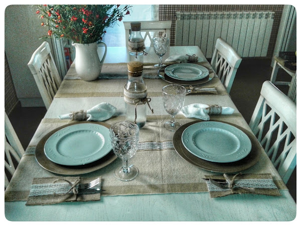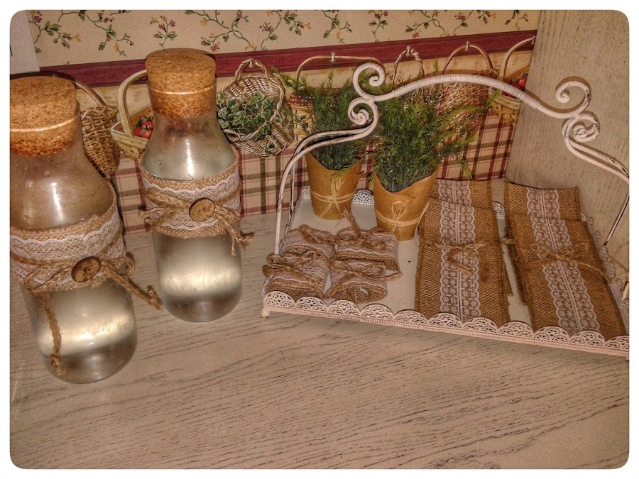 Con rollos de cinta de tela de yute ancha, cinta de tela de yute estrecha con puntilla, cinta de pegar con la plancha, velcro adhesivo, perlas y la súper pistola de silicona caliente, tenemos estos complementos para decorar la mesa.