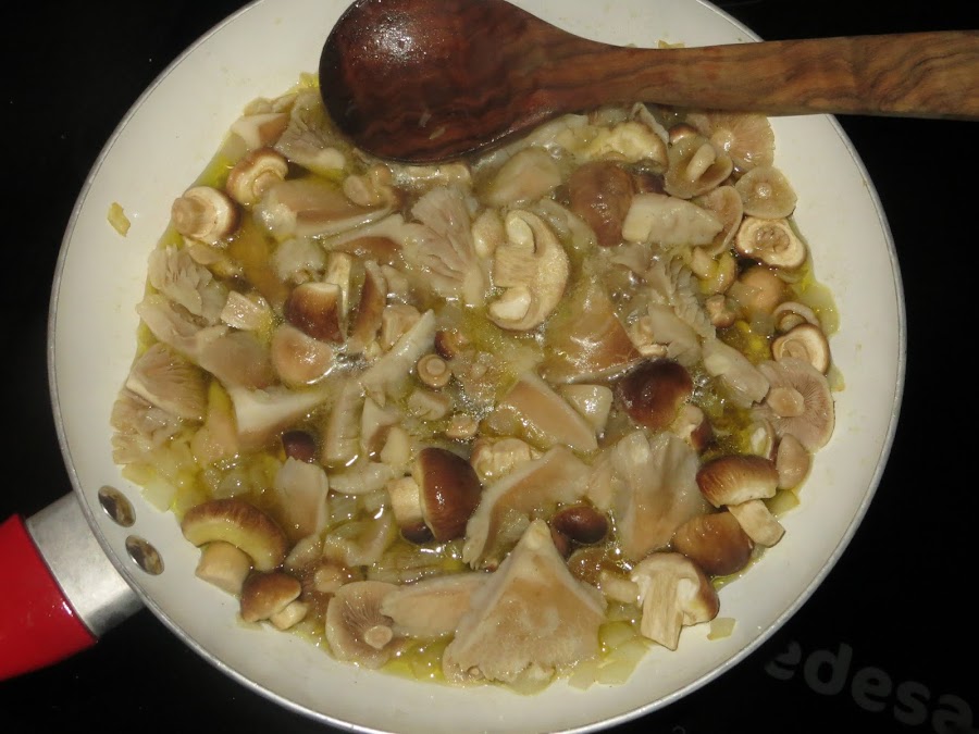 Se echa un chorro generoso de aceite en la sartén y se ponen a freír los ajos cortados en trozos pequeños cuando veamos que comienza a dorarse añadimos las setas, en este caso de chopo. Pasados unos 25 minutos, cuando vemos que han soltado todo el agua y ya están casi cocinadas, sacamos a un plato.