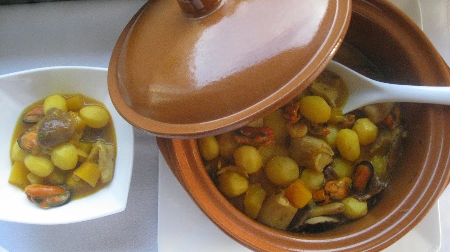 Añadimos las patatas pequeñas, regamos con el agua de cocción de los mejillones azafrán y echamos el azafrán. Cuando las patatas estén casi cocidas añadimos las viandas de mejillón. Ya tenemos un guiso rico para degustar.