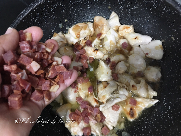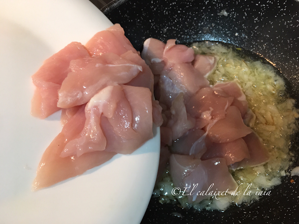 una vez esté transparente ponemos la pechuga troceada y sofreimos