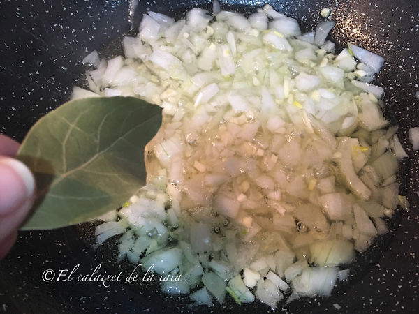 añadimos la hoja de laurel y dejamos pochar a fuego lento