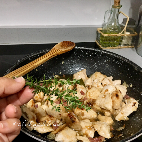 a continuación añadimos un vaso de agua, removemos y dejamos que se cocine el pollo hasta que se evapore la mitad de el caldo y la salsa espese