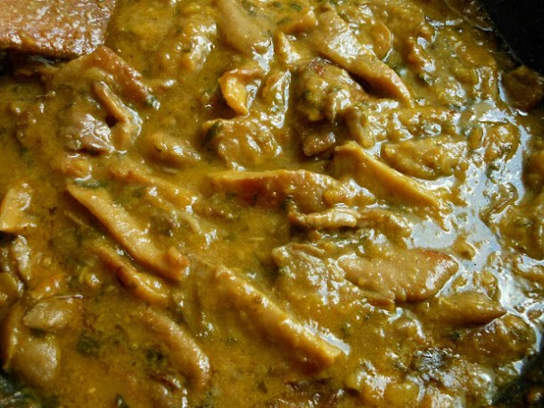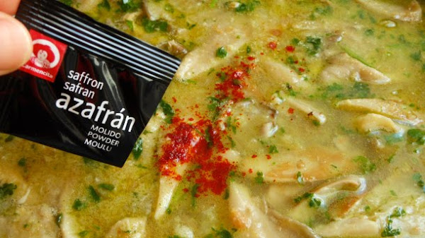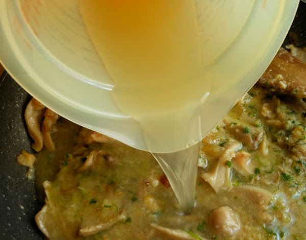Vierte el contenido del mortero sobre las setas y las cebollas; agrega seguidamente el resto del caldo o en su defecto el agua y la pastilla de caldo de pollo.